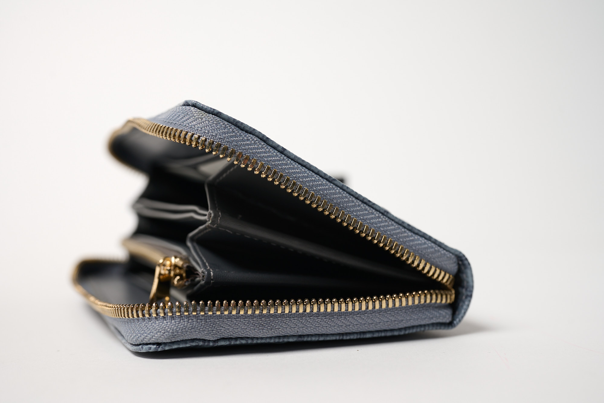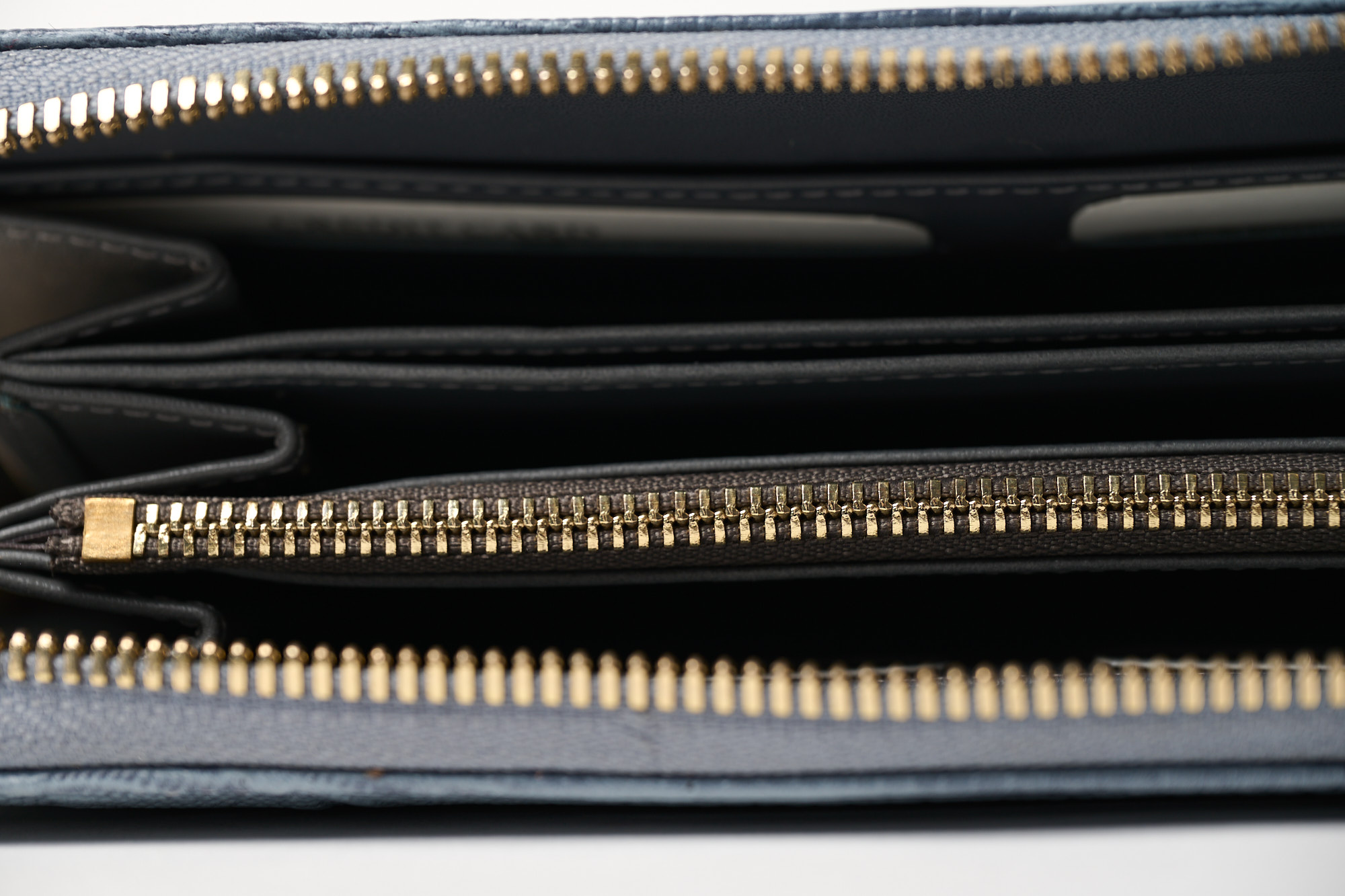 Γυναικείο δερμάτινο πορτοφόλι σε γαλάζιο χρώμα και κροκό τύπωμα με χρυσό φερμουάρ. Διαθέτει 8 θήκες για κάρτες, 6 μεγάλες για χαρτονομίσματα και άλλα έγγραφα και μια με φερμουάρ για ψιλά.