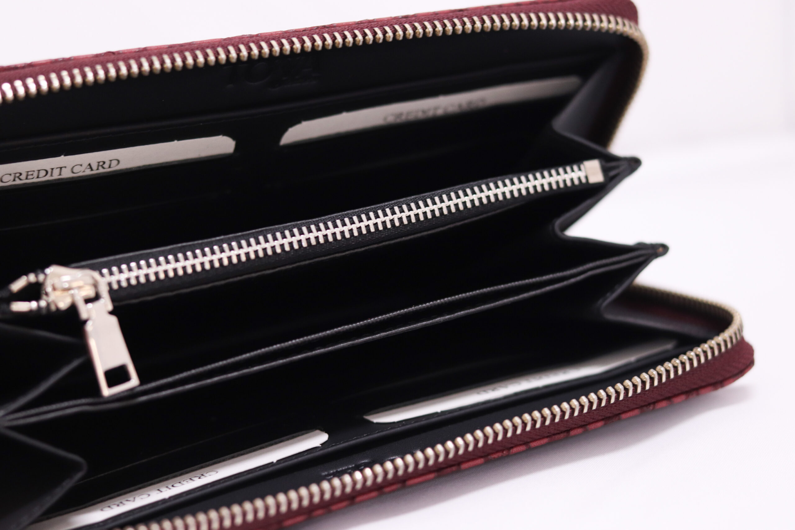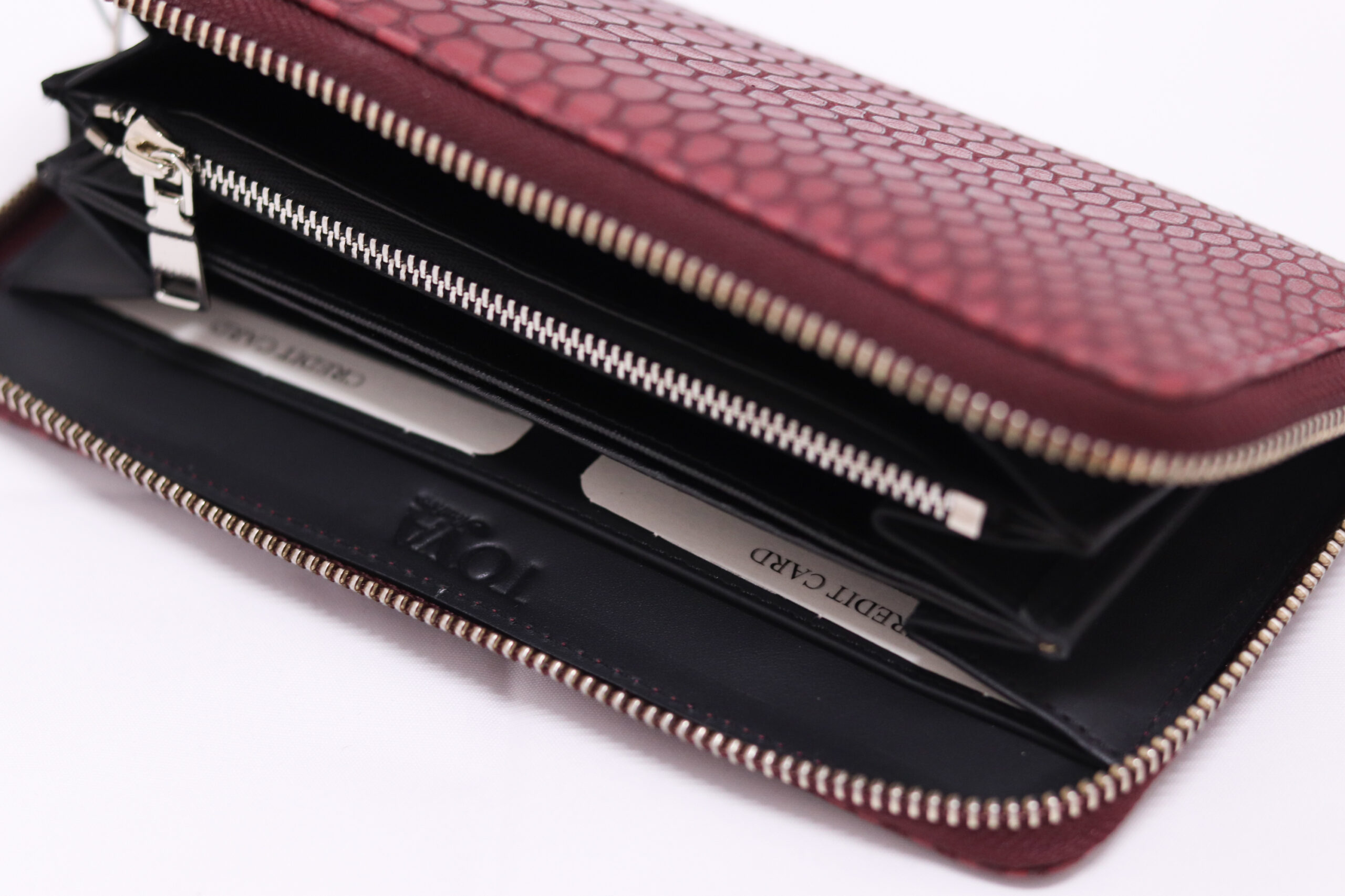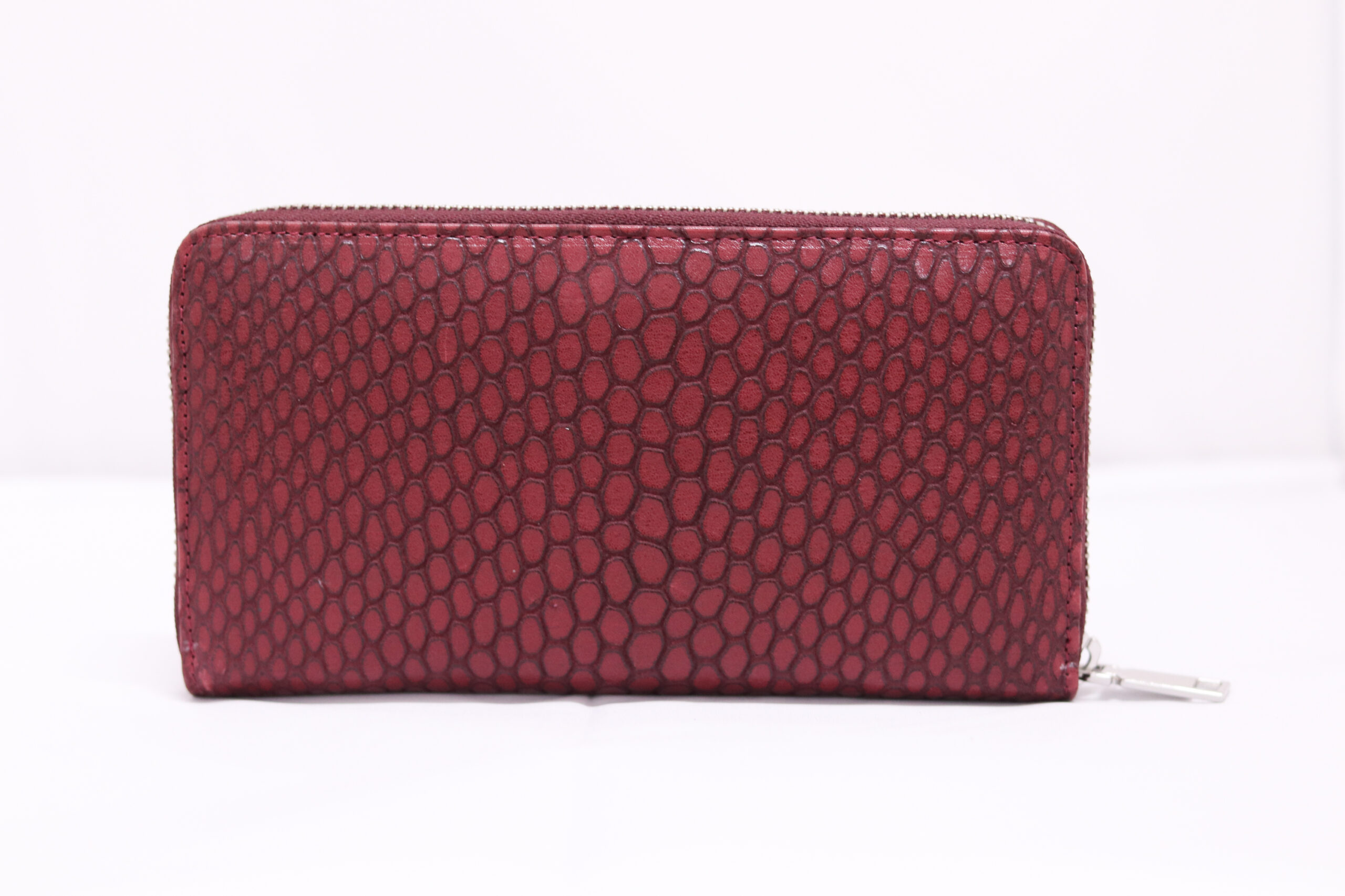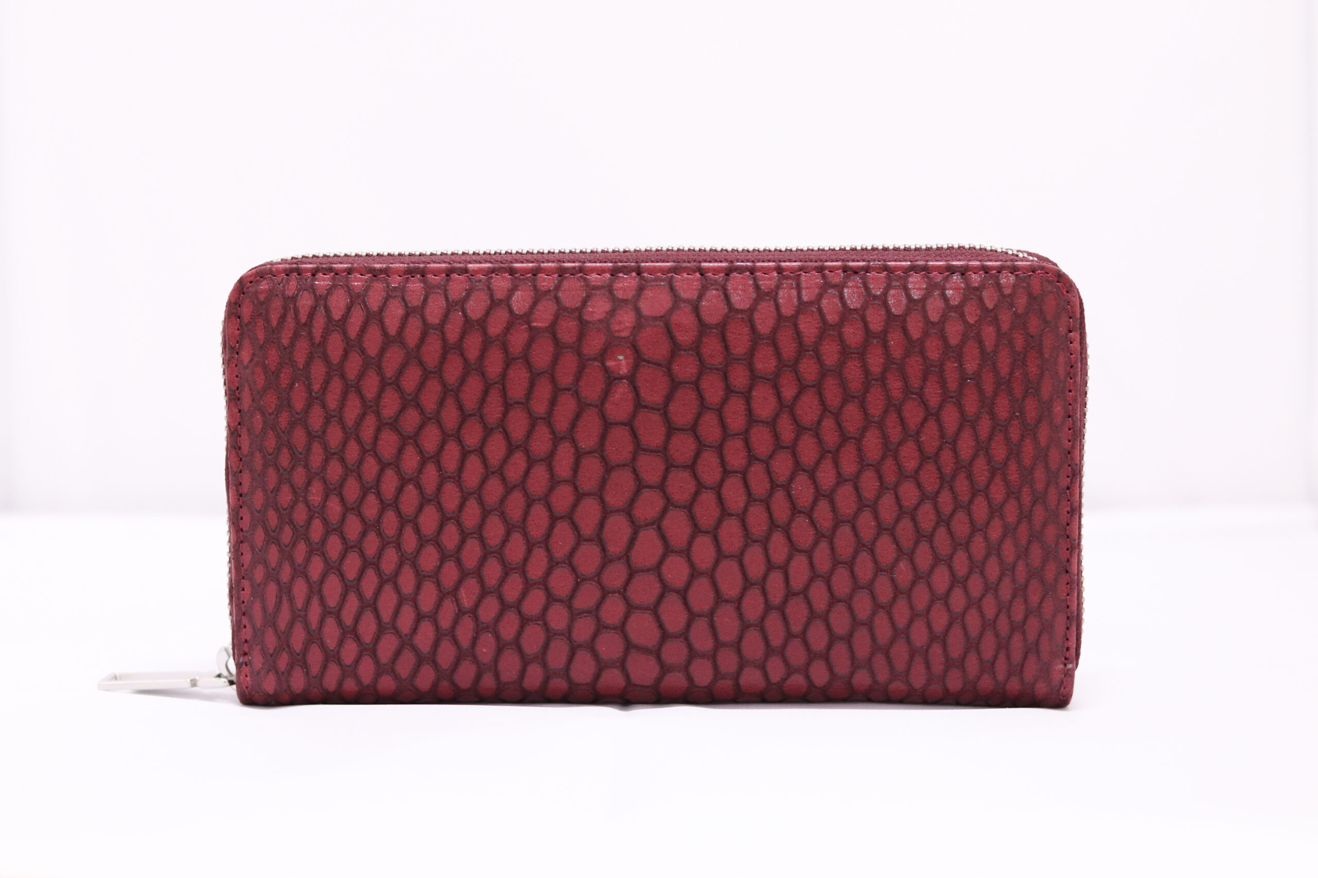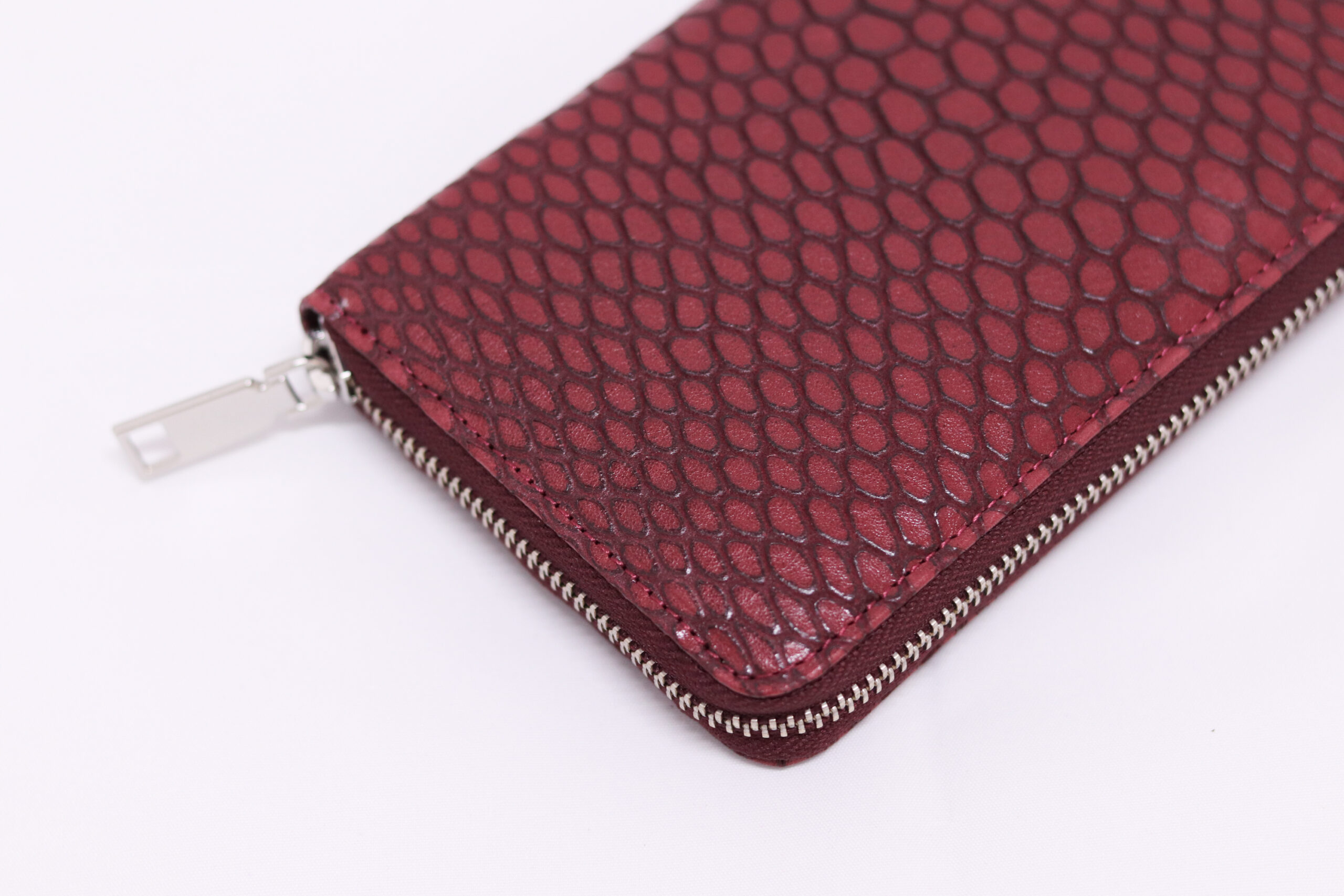 Γυναικείο δερμάτινο πορτοφόλι σε μπορντό χρώμα και τύπωμα φιδιού,με ασημί φερμουάρ. Διαθέτει 8 θήκες για κάρτες, 6 μεγάλες για χαρτονομίσματα και άλλα έγγραφα και μια με φερμουάρ για ψιλά.
