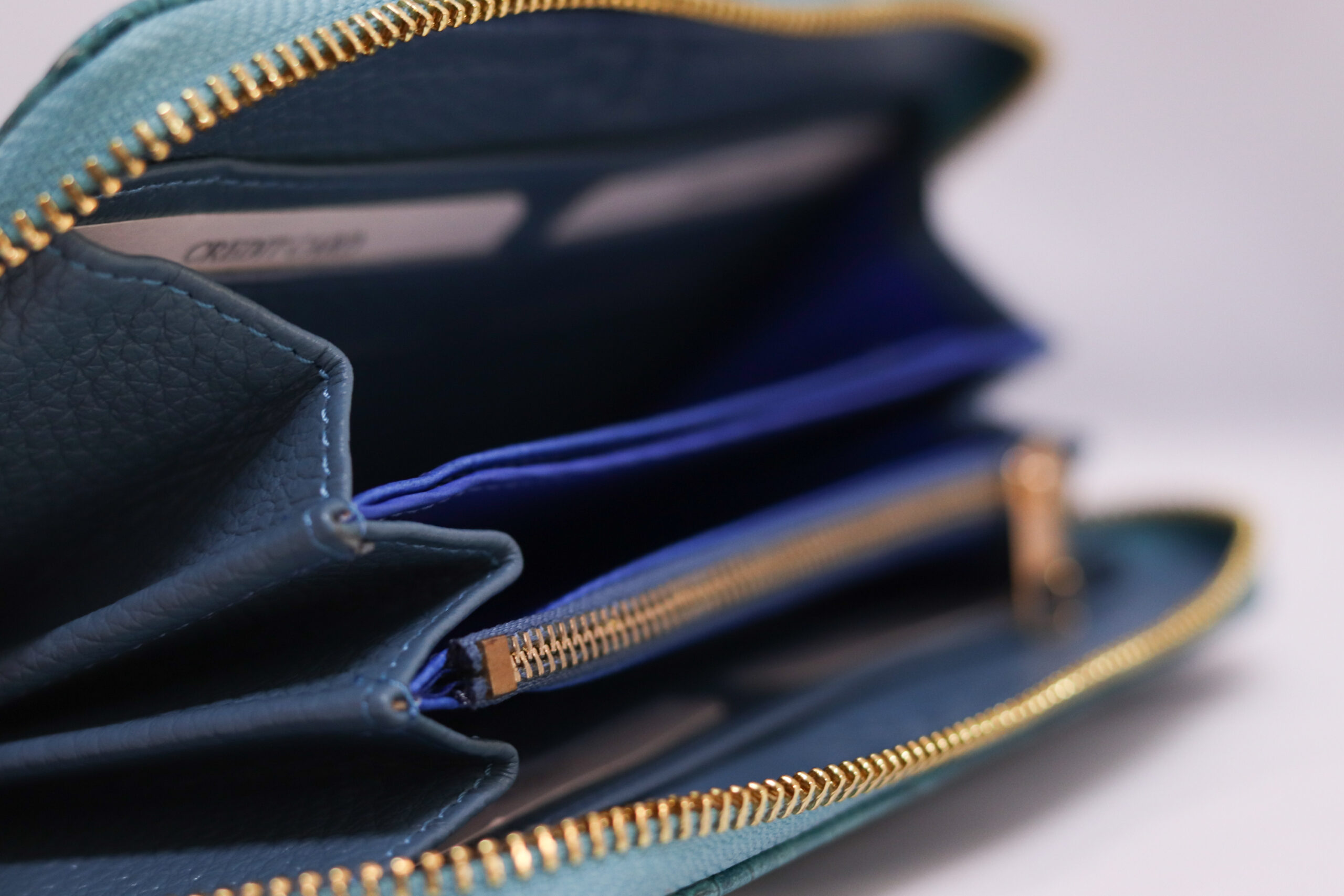 Γυναικείο δερμάτινο πορτοφόλι σε τιρκουάζ χρώμα με χρυσό φερμουάρ. Διαθέτει 8 θήκες για κάρτες, 6 μεγάλες για χαρτονομίσματα και άλλα έγγραφα και μια με φερμουάρ για ψιλά.