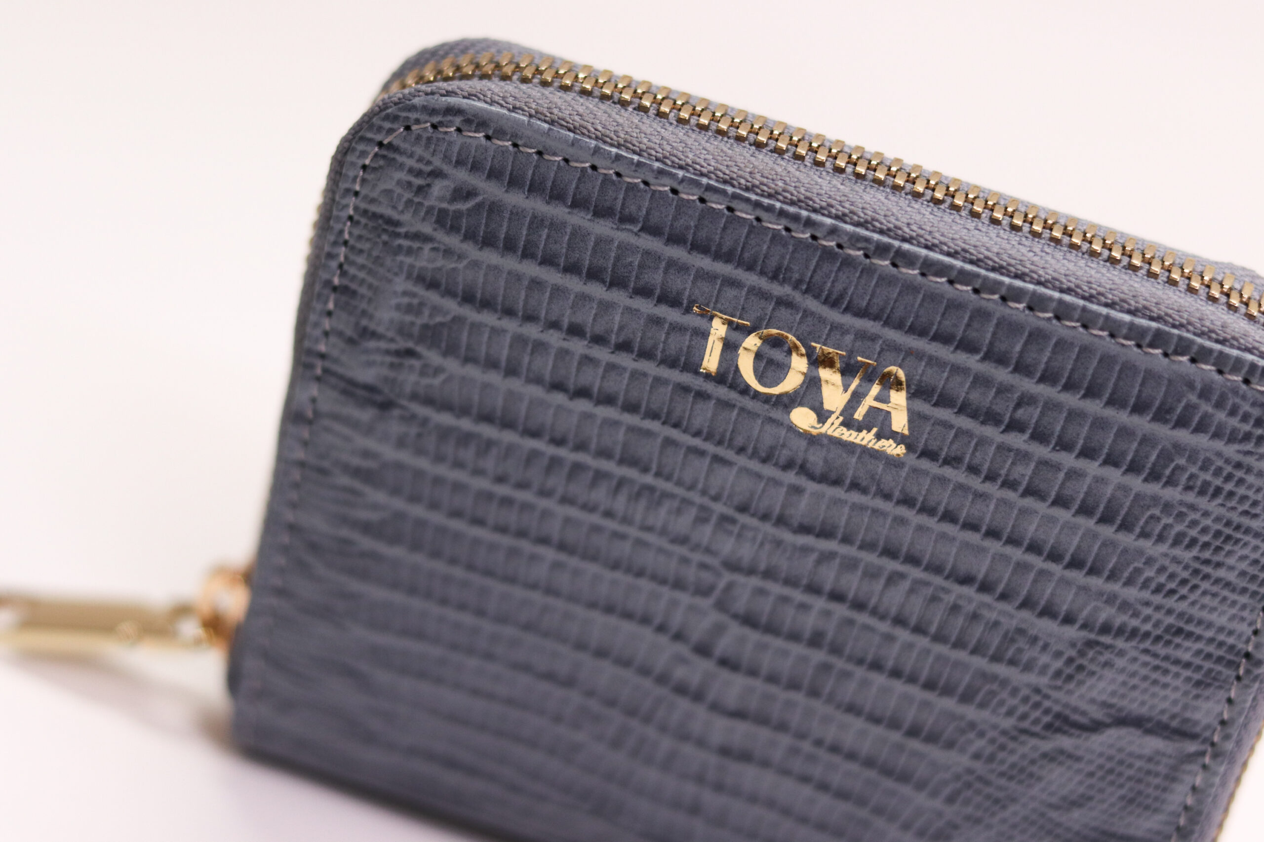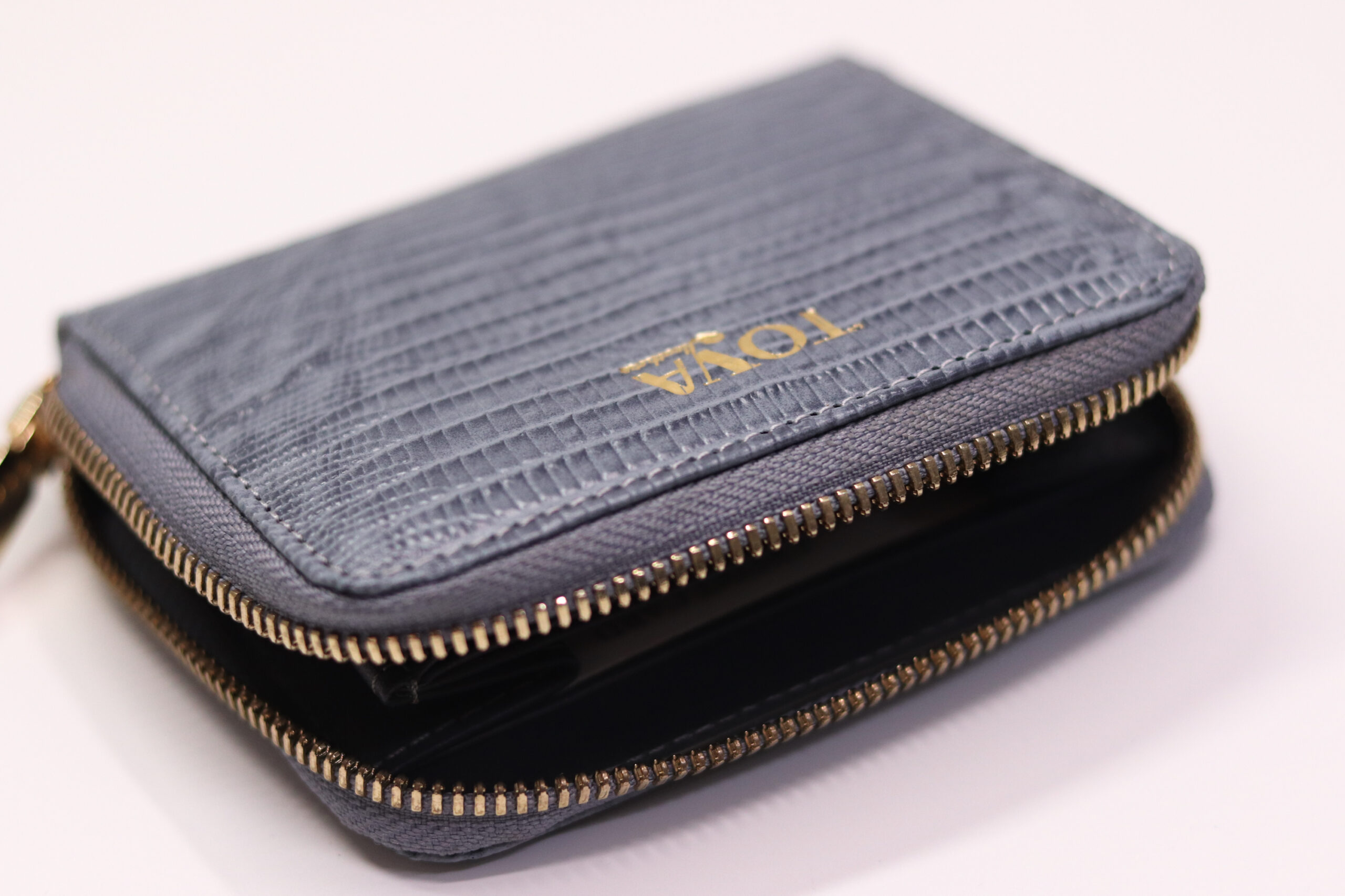 Γυναικείο μικρό πορτοφόλι με χρυσό φερμουάρ, κατασκευασμένο από γνήσιο δέρμα με τύπωμα κροκό, σε χρώμα γαλάζιο. Διαθέτει 7 θήκες για κάρτες και χωράει ταυτότητα και δίπλωμα νέου τύπου.