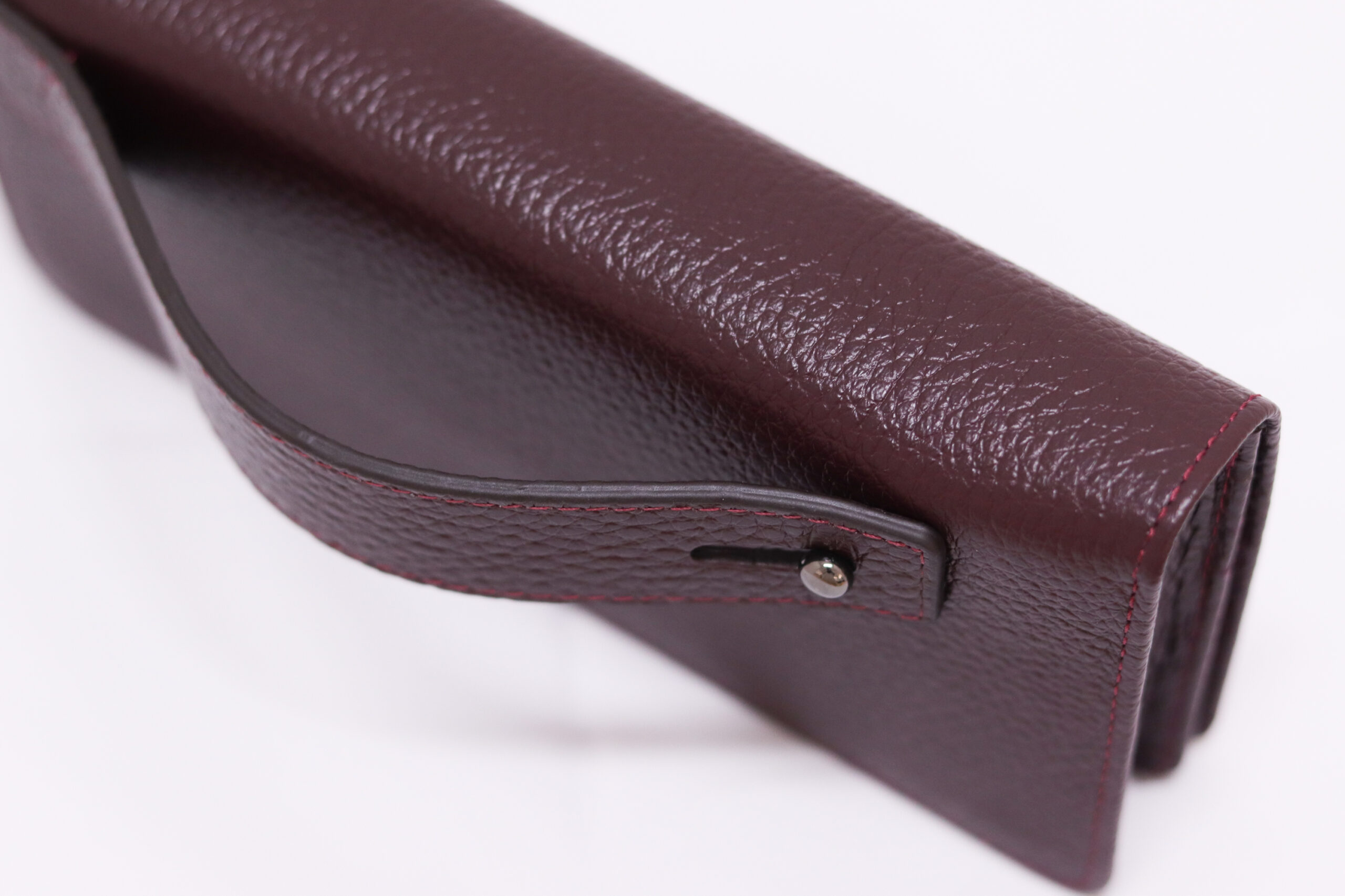 Γυναικείο δερμάτινο πορτοφόλι σε βουργουνδί χρώμα με μαγνητικό κούμπωμα. Διαθέτει 12 θήκες για κάρτες, 2 μεγάλες για χαρτονομίσματα και άλλα έγγραφα και μια με φερμουάρ για ψιλά. Χωράει κινητό τηλέφωνο και έχει δερμάτινο χερούλι εξωτερικά για να μπορεί να κρατηθεί στο χέρι