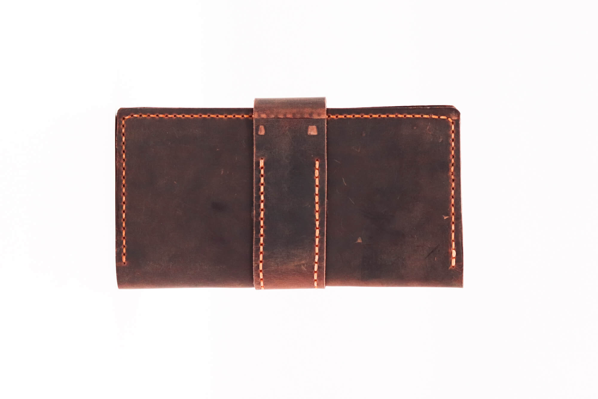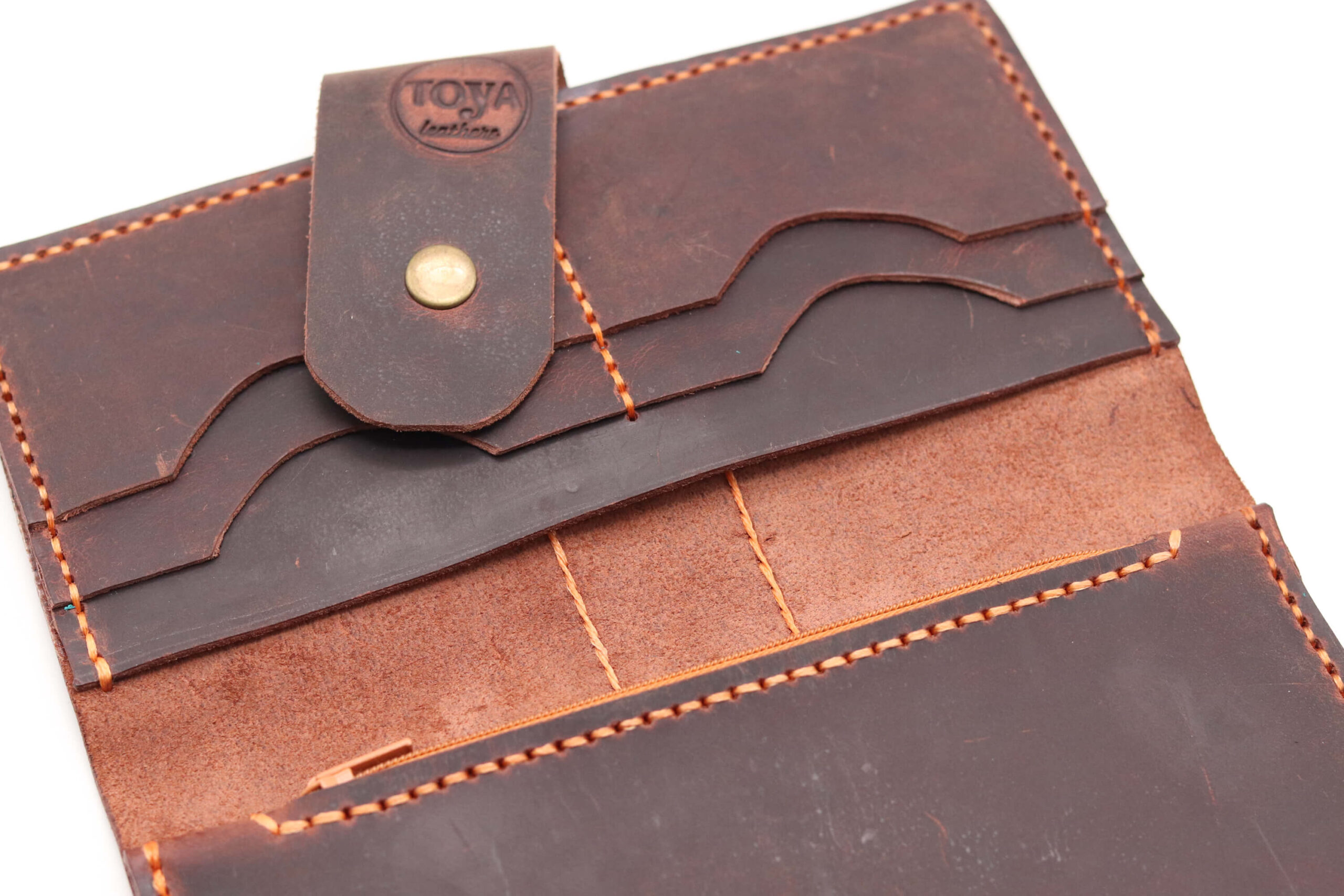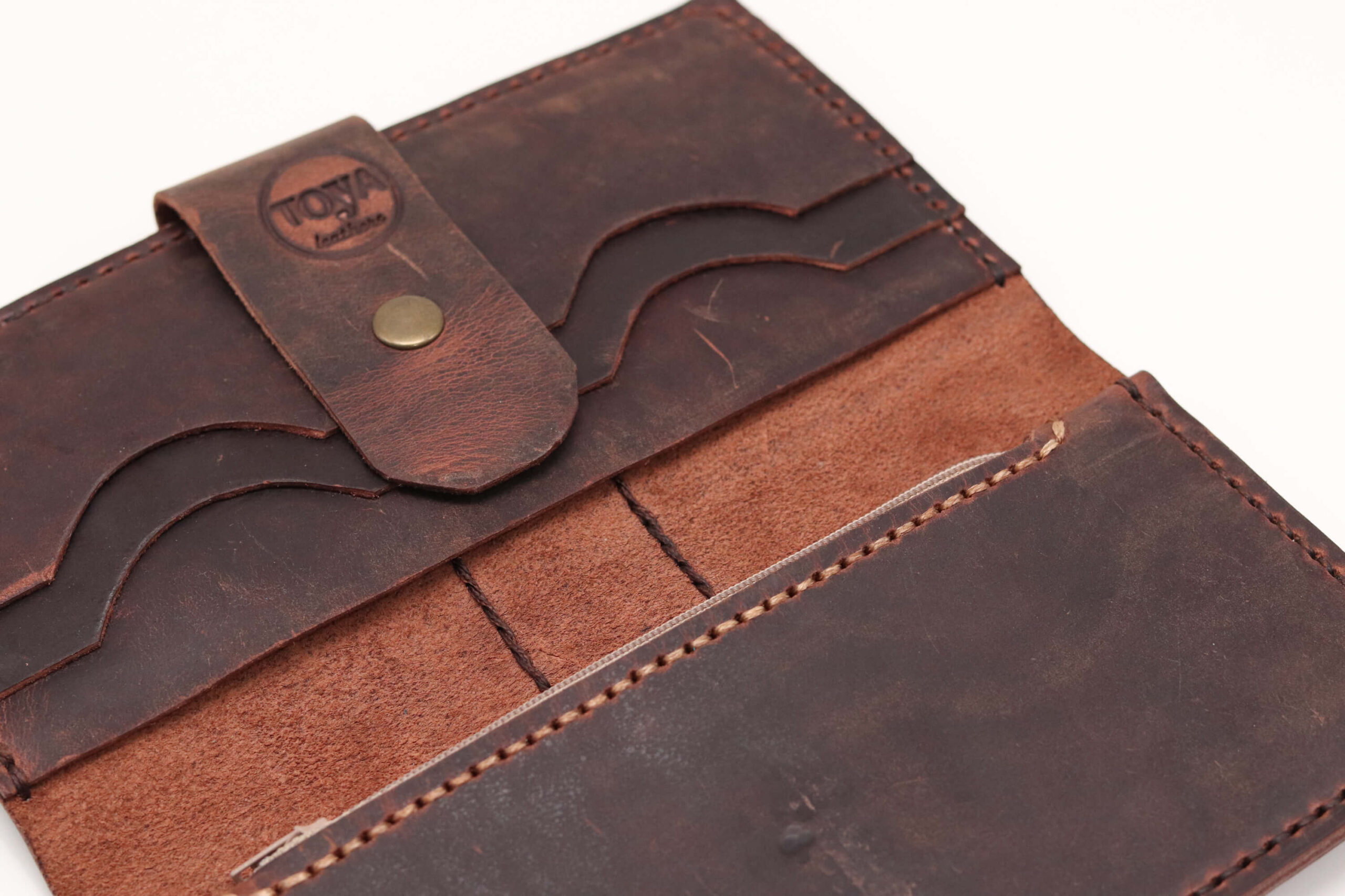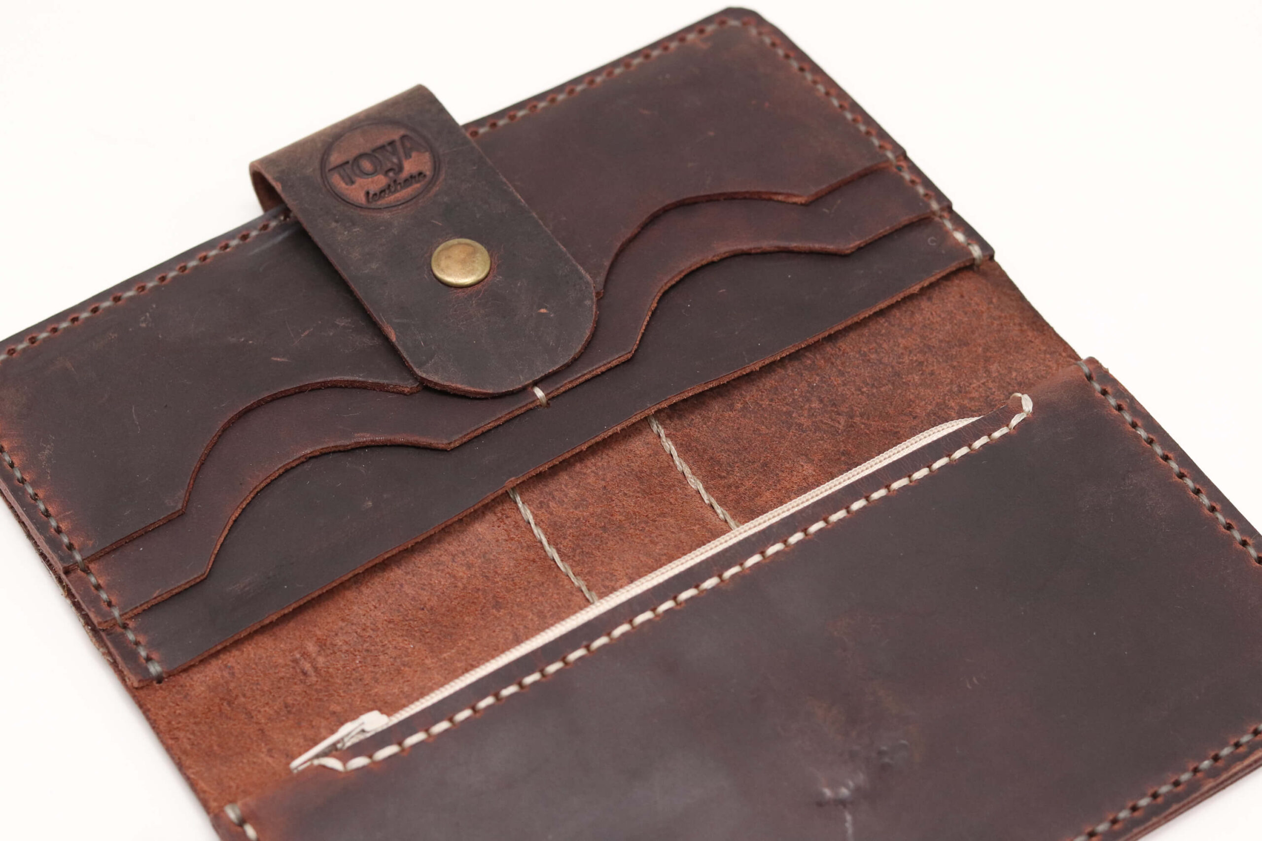 Γυναικείο χειροποίητο δερμάτινο πορτοφόλι σε σκούρο καφέ χρώμα με εξωτερική ραφή. Είναι ραμμένο στο χέρι και η λεπτομέρεια με την κλωστή ίσως διαφέρει σε κάθε κομμάτι. Διαθέτει 4 θήκες για κάρτες, 2 μεγάλες για χαρτονομίσματα και άλλα έγγραφα (χωράει και κινητό) και μια με φερμουάρ για ψιλά.
