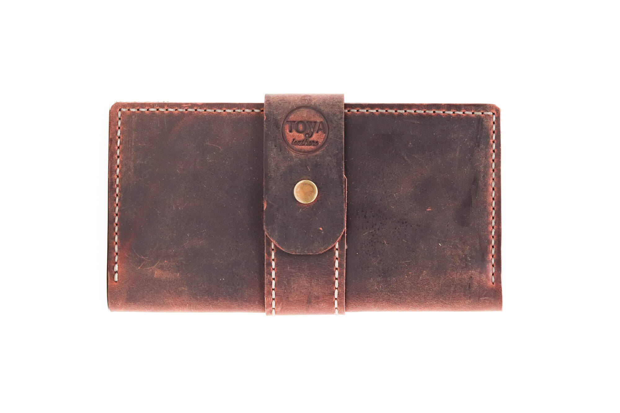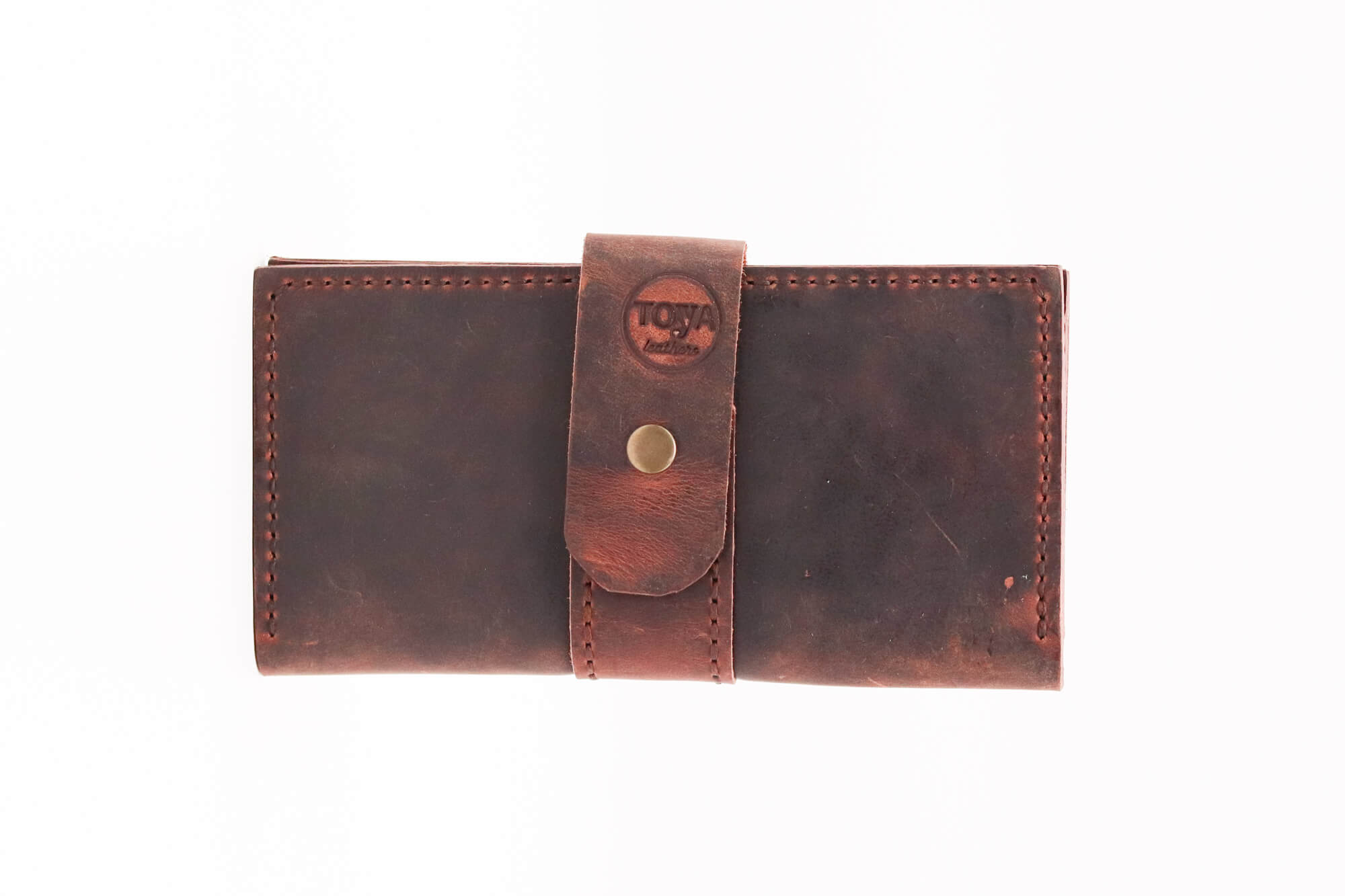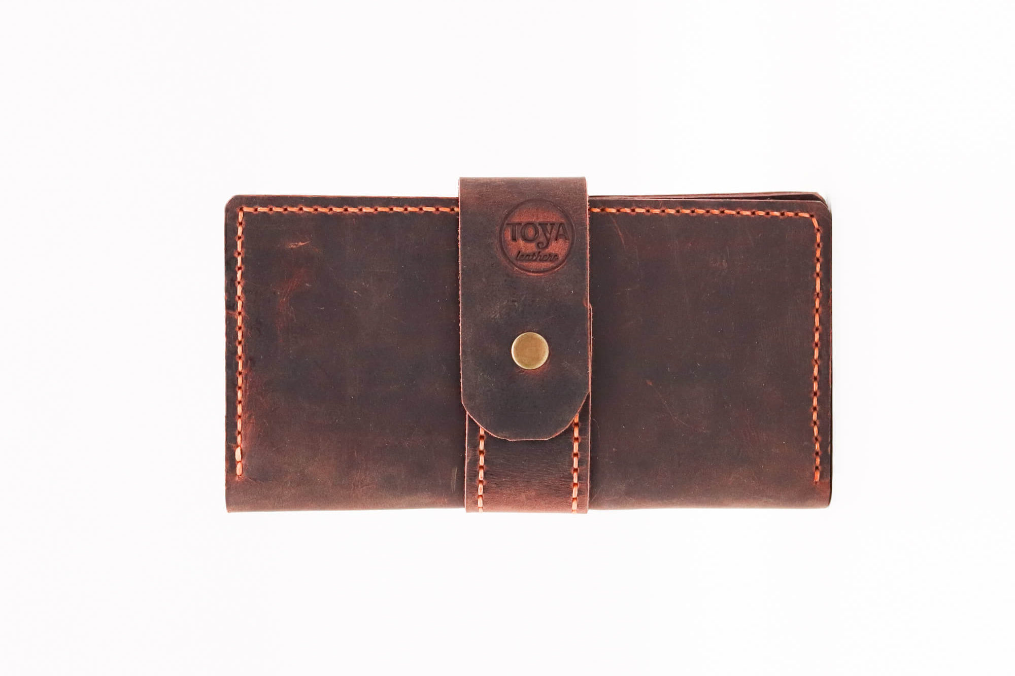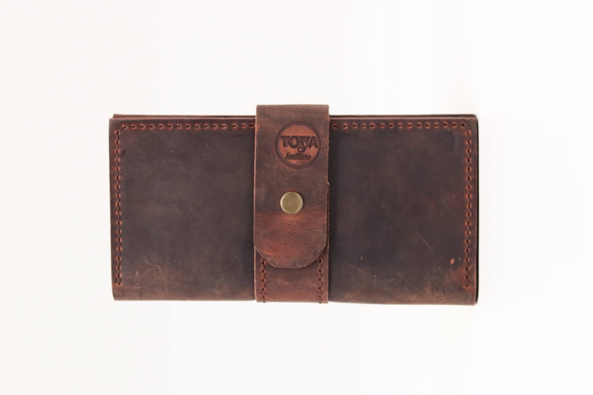 Γυναικείο χειροποίητο δερμάτινο πορτοφόλι σε σκούρο καφέ χρώμα με εξωτερική ραφή. Είναι ραμμένο στο χέρι και η λεπτομέρεια με την κλωστή ίσως διαφέρει σε κάθε κομμάτι. Διαθέτει 4 θήκες για κάρτες, 2 μεγάλες για χαρτονομίσματα και άλλα έγγραφα (χωράει και κινητό) και μια με φερμουάρ για ψιλά.