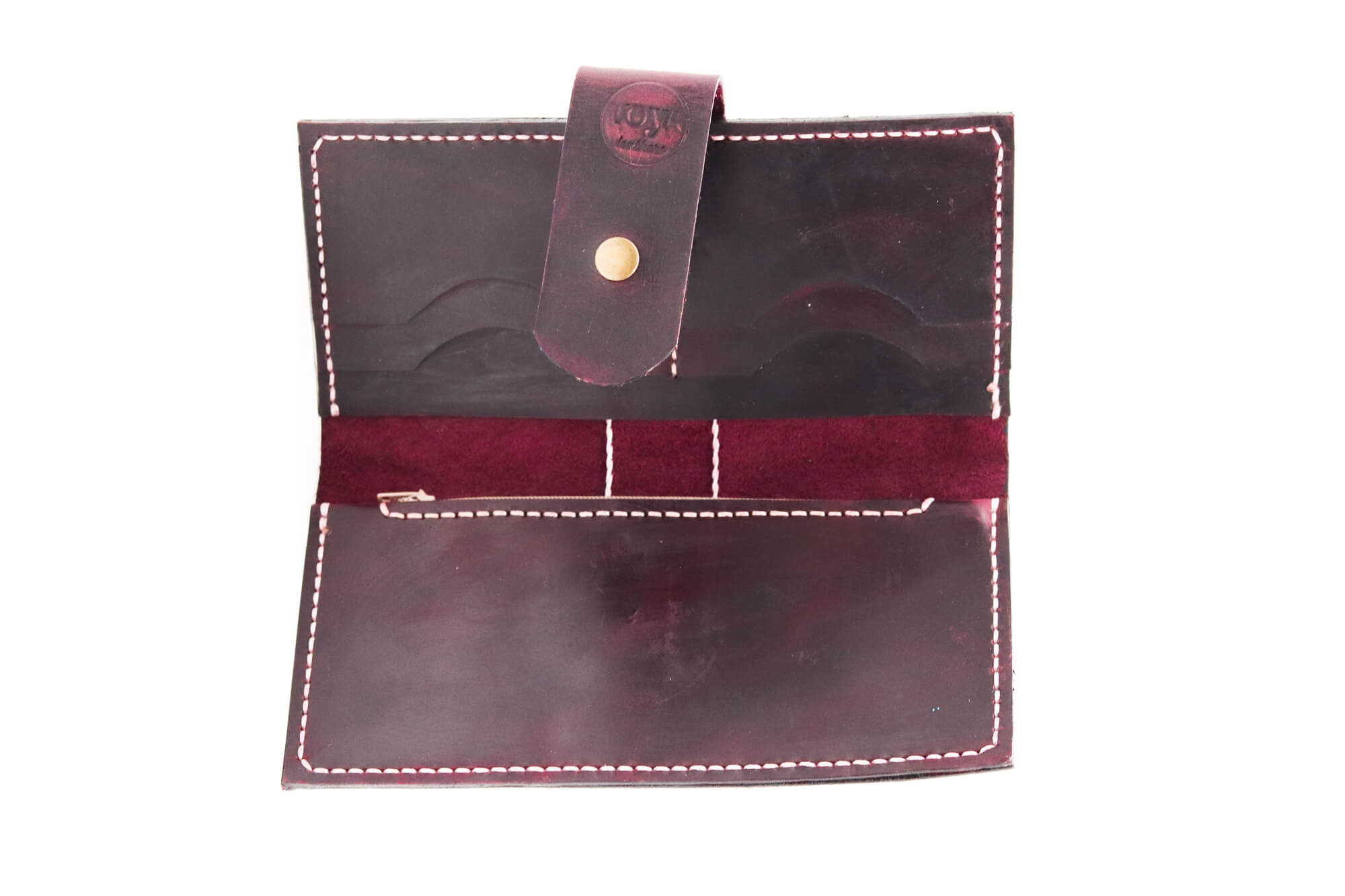 Είναι ραμμένο στο χέρι και η λεπτομέρεια με την κλωστή ίσως διαφέρει σε κάθε κομμάτι. Διαθέτει 4 θήκες για κάρτες, 2 μεγάλες για χαρτονομίσματα και άλλα έγγραφα (χωράει και κινητό) και μια με φερμουάρ για ψιλά.