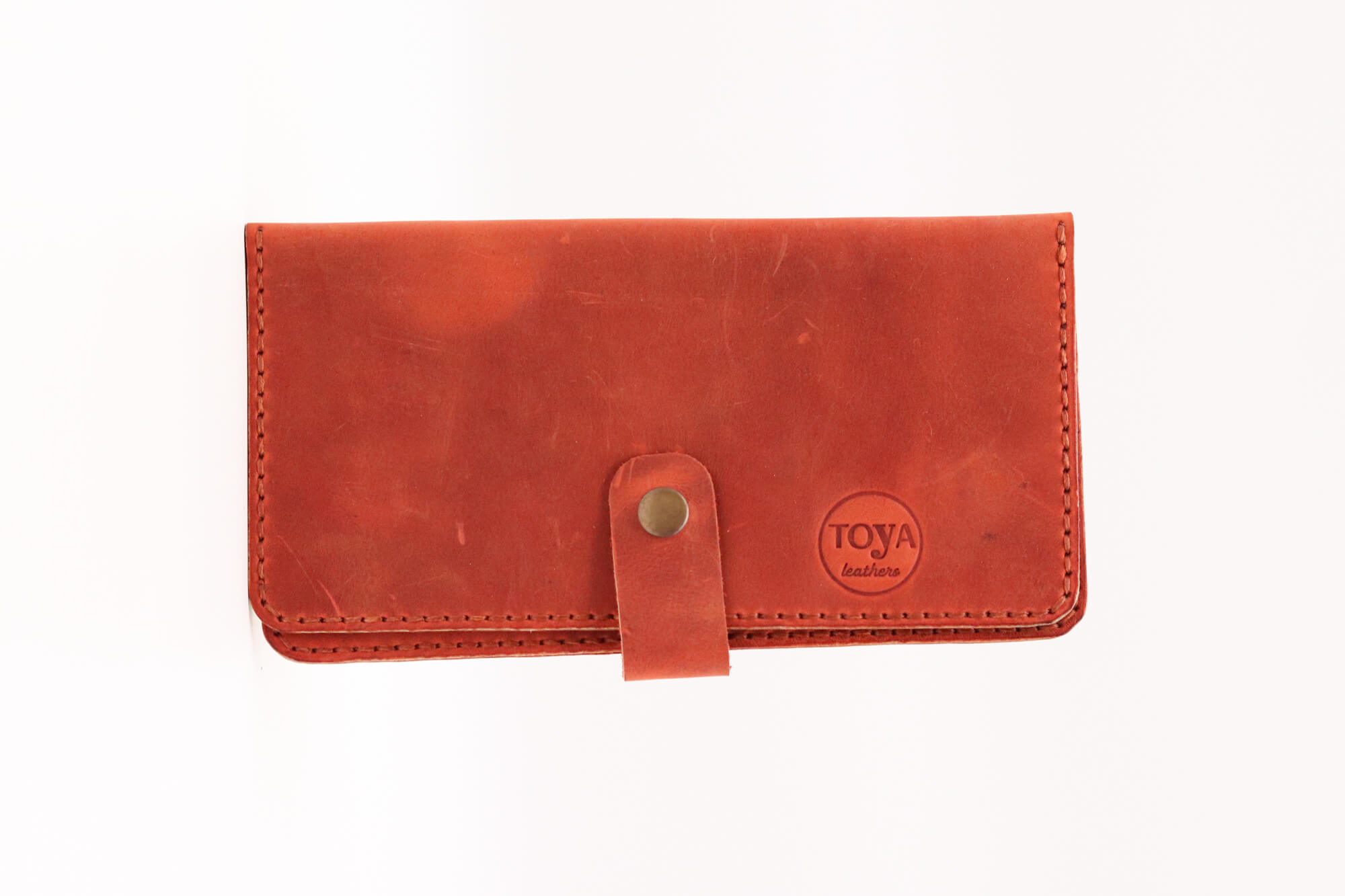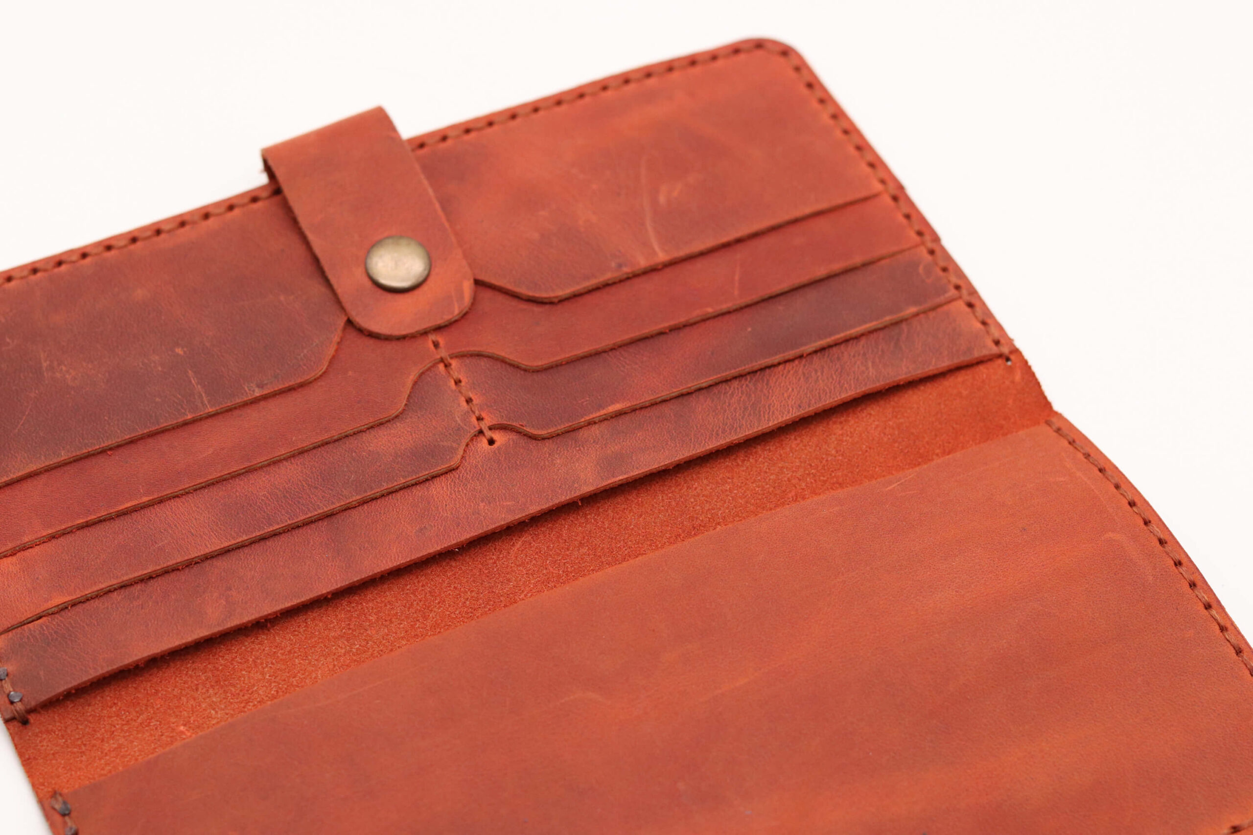 Γυναικείο χειροποίητο δερμάτινο πορτοφόλι σε πορτοκαλί χρώμα με εξωτερική ραφή. Είναι ραμμένο στο χέρι και η λεπτομέρεια με την κλωστή και η σφραγίδα,ίσως διαφέρουν σε κάθε κομμάτι. Διαθέτει 6 θήκες για κάρτες, 2 μεγάλες για χαρτονομίσματα και άλλα έγγραφα (χωράει και κινητό)