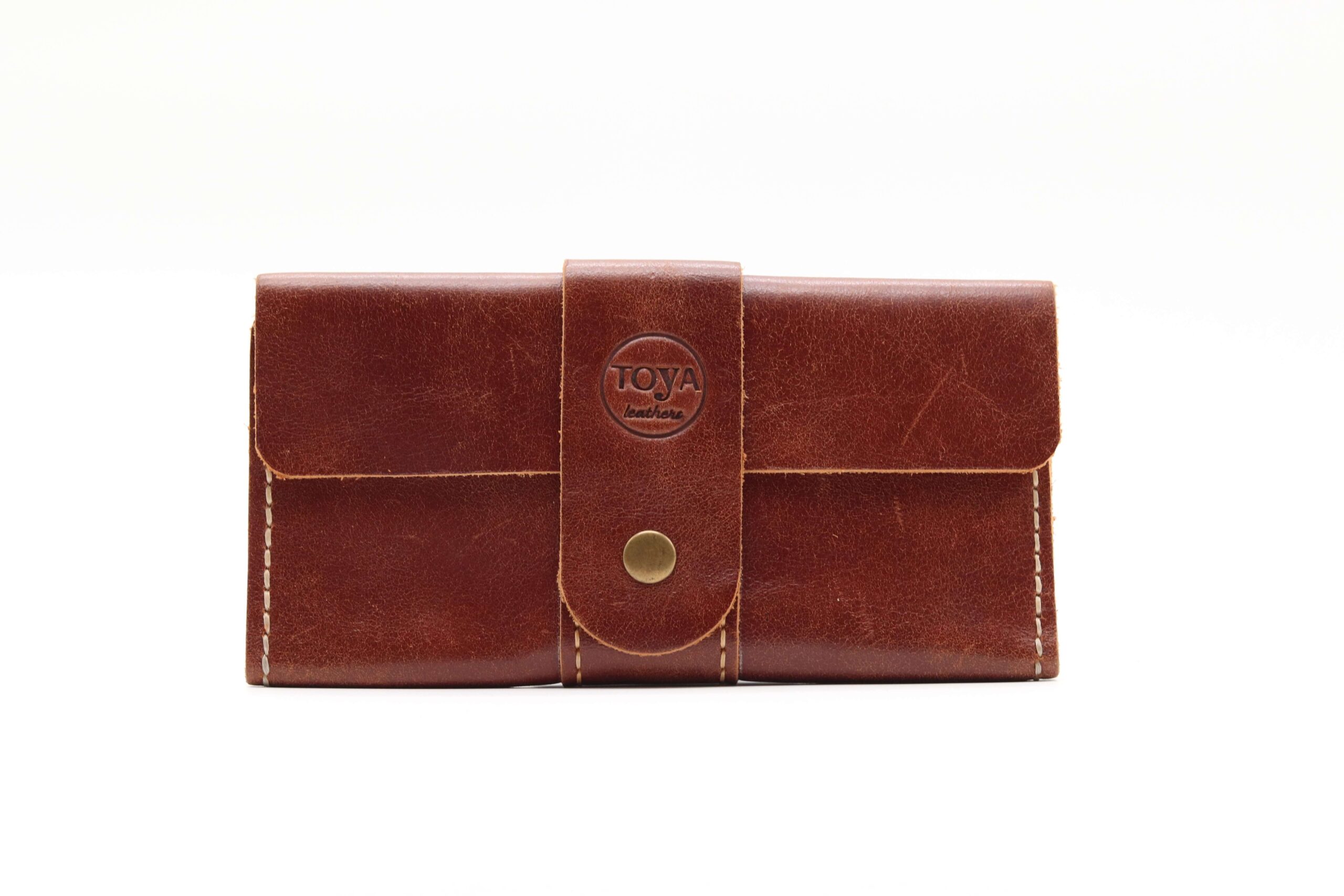 Γυναικείο χειροποίητο δερμάτινο πορτοφόλι σε ταμπά χρώμα. Είναι ραμμένο στο χέρι. Διαθέτει 5 θήκες για κάρτες, 3 μεγάλες για χαρτονομίσματα και άλλα έγγραφα.